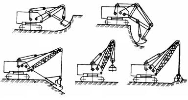 Рис. 91. Основные виды сменного рабочего оборудования строительных экскаваторов с механическим приводом: а – прямая лопата; б – обратная лопата; в – драглайн; г – крановое оборудование; д – грейферное оборудование