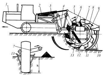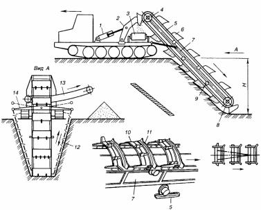 Рис. 103. Скребковый двухцепной экскаватор: 1 – гидроцилиндры; 2 – рычаги; 3 – ленточный конвейер; 4 – ведущие звездочки; 5 – замкнутые пластинчатые цепи; 6 – ковши; 7 – наклонная рама; 8 – натяжные звездочки; 9 – промежуточные ролики; 10 – режущие элементы скребкового типа; 11 – транспортирующие заслонки; 12 – активные цепные откосообразователи; 13 – ленточный конвейер; 14 – качающийся