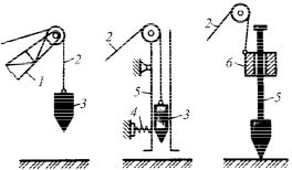 Рис. 105. Рабочие органы машин ударного действия: а – с ненаправленными ударами: 1 – крановая стрела; 2 – подъемный канат; 3 – клин-молот; б – то же, с направленными: 4 – амортизирующие элементы; 5 – жесткие направляющие; в – с забиваемым клином: 5 – направляющая; 6 – свободно падающий груз