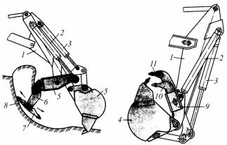Рис. 106. Оборудование захватно-клещевого типа: а – с однозубным; б – с трехзубным рыхлителями; 1 – рукоять; 2 – пара гидроцилиндров; 3 – гидроцилиндр; 4 – ковш прямой или обратной лопаты; 5 – двуплечный рычаг; 6 – двусторонний клык-рыхлитель; 7 – передние зубья; 8 – задние зубья; 9 – сварная рама; 10 – сменные боковые зубья;