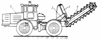 Рис. 107. Однобаровая щелерезная машина: 1 – базовый трактор; 2 – механизмы привода; 3 – механизны заглебления; 4 – цепной рабочий орган
