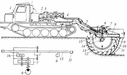 Рис. 108. Дисковая щелерезная машина: 1 – кабина; 2 – раздаточная коробка; 3 – гидроцилиндры; 4, 8 – рамы; 5 – телескопическая тяга; 6 – высокомоментный гидромотор; 7 – зубчатый редуктор; 9 – зубчатый венец; 10 – зачистное устройство; 11 – зубодержатели; 12 – зубья; 13 – диск; 14 – опора рамы; 15 – плужки; 16 – выходная шестерня