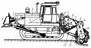 Рис. 109. Землеройно-фрезерная машина: 1 – бульдозерный отвал; 2 – противовес; 3 – базовый трактор; 4 – ходоуменьшитель; 5 – редуктор отбора мощьности; 6 – предохранительная муфта предельного момента; 7 – цепные передачи; 8 – бортовые редукторы; 9 – поперечная балка; 10 – привод фрезы; 11 – нижняя рама; 12 – гидроцилиндры
