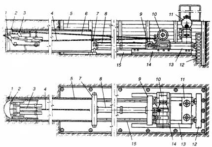 Рис. 115. Установка для прокладки трубопроводов продавливанием с механизированной разработкой грунта: 1 – ножевая секция; 2 – ковш; 3 – система рычагов; 4 – тяговый канат; 5 – торец прокладываемого звена трубопровода; 6 – канат; 7, 9 – траверса; 8 – нажимные патрубки; 10 – двухбарабанная лебедка; 11 – насосная станция; 12 – опорный башмак, 13 – гидравлические домкраты; 14 – основная рама; 15 – направляющая