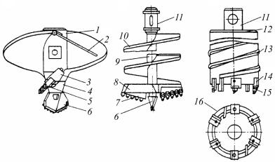 Рис. 116. Буры бурильно-крановых машин: а – лопастной: 1 – корпус; 2 – заслонка; 3 – резцедержатели; 4 – направляющая; 5 – сменные резцы; 6 – забурник; б – шнековый: 7 – резцы; 8 – сменная бурильная головка; 9 – трубчатый остов; 10 – транспортирующие грунт спирали; 11 – хвостовик; в – кольцевой: 12 – корпус; 13 – винтовые лопасти; 14 –