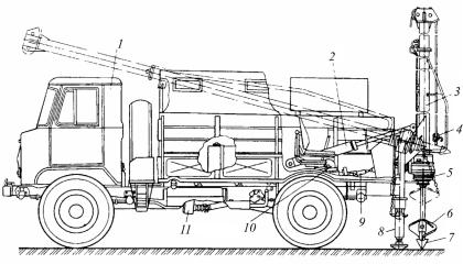 Рис. 117. Неповоротная бурильно-крановая машина: 1 – базовый автомобиль; 2 – гидроцилиндр; 3 – бурильная мачта; 4 – крюковая обойма; 5 – вращатель; 6 – лопастной бур; 7 – забурник; 8 – гидродомкрат; 9 – карданный вал; 10 – раздаточная коробка; 11 – коробка отбора мощности