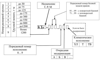 Цифры индекса последовательно обозначают: первая цифра – номер размерной группы, в том числе соответствующий номинальному грузовому моменту, последующие две цифры – порядковый номер базовой модели. После точки указывается порядковый номер исполнения крана (0–9), который может отличаться от базовой модели длиной стрелы, высотой подъема, грузоподъемностью. В обозначении базовых моделей номер исполнения 0 обычно не ставится. Буквы (А, Б, В…), стоящие в индексе после цифр, обозначают очередную модернизацию (изменение конструкции без изменения основных параметров) и климатическое исполнение крана (ХЛ – для холодного, Т – тропического и ТВ – тропического влажного климата).