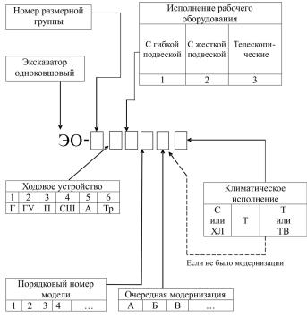 Система индексации одноковшовых универсальных экскаваторов представлена на рис. 6. Буквы ЭО означают, что экскаватор одноковшовый универсальный. Четыре основные цифры индекса последовательно означают: размерную группу машины, тип ходового устройства, конструктивное исполнение рабочего оборудования (вид подвески) и порядковый номер данной модели. Восемь размерных групп экскаваторов обозначаются цифрами с 1-й по 8-ю. Размер экскаватора характеризуют масса машины и мощность основного двигателя, а также геометрическая вместимость основного ковша. Тип ходового устройства указывается цифрами с 1-й по 9-ю: 1 – гусеничное (Г), 2 – гусеничное уширенное (ГУ), 3 – пневмоколесное (П), 4 – специальное шасси автомобильного типа (СШ), 5 – шасси грузового автомобиля (А), 6 – шасси серийного трактора (Тр), 7 –