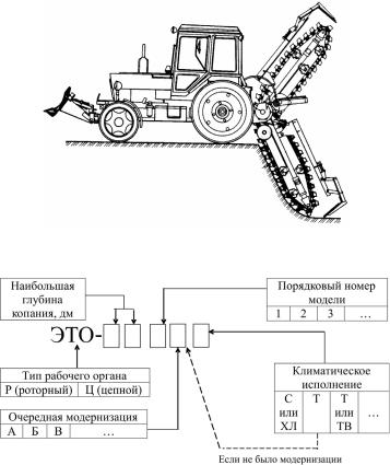 Первые две буквы ЭТ означают экскаватор траншейный, а третья – тип рабочего органа (Ц – цепной, Р – роторный). Первые две цифры индекса обозначают наибольшую глубину отрываемой траншеи, третья – порядковый номер модели. Первая из дополнительных букв после цифрового индекса (А, Б, В и т.д.) означает порядковую модернизацию машины, последующие – вид специального климатического исполнения (ХЛ – северное, Т – тропическое, ТВ – для работы во влажных тропиках).