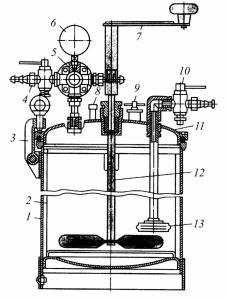 Рис. 143. Красконагнетательный бак: 1 – корпус; 2 – сменная емкость; 3 – накидные скобы; 4 – кран для сжатого воздуха; 5 – редуктор для подачи воздуха и выдачи краски; 6 – манометр; 7 – рукоять привода смесителя; 8 – клапан сброса давления; 9 – загрузочное устройство; 10 – кран для подачикраски; 11 – крышка; 12 – лопастнойсмеситель; 13 – фильтр
