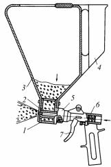 Рис. 144. Крошкомет-распылитель: 1 – головка; 2 – трубка; 3 – расходный бункер; 4 – рукоять; 5 – корпус; 6 – регуляторходатрубки; 7 – курок