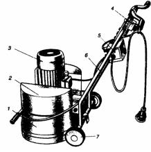 Рис. 153. Ручная мозаично-шлифовальная машина: 1 – шлифовальные головки; 2 – пригрузы; 3 – электродвигатель; 4 – механизм пуска; 5 – электрооборудование; 6 – рукоятки управления; 7 – колеса