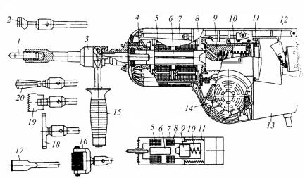 Электромагнитный перфоратор (рис. 166) с энергией удара 2,5 Дж работает в трех режимах: ударном, ударно-вращательном и вращательном. Конструктивное исполнение электромагнитного перфоратора объединяет вышерассмотренные конструкции электрического молотка и электродрели.