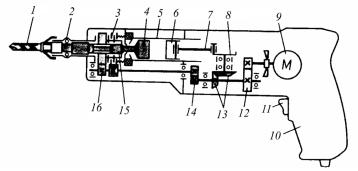 Рис. 165. Компрессионно-вакуумный перфоратор: 1 – рабочий инструмент; 2 – механизм; 3 – фрикционная муфта предельного момента; 4 – боек; 5 – цилиндр; 6 – поршень; 7 – шатун; 8 – кривошип; 9 – однофазный коллекторный электродвигатель; 10 – основная рукоятка; 11 – выключатель; 12, 14, 16 – цилиндрические шестерни; 13 – конические