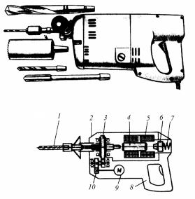 Рис. 166. Электромагнитный перфоратор: 1 – рабочий инструмент; 2 – пластмассовый корпус; 3 – муфта предельного момента; 4 – боек; 5 – магнитная катушка; 6 – буфер; 7 – амортизатор; 8 – основная рукоятка; 9 – электродвигатель; 10 – редуктор