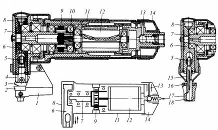 Рис. 176. Пневматические ножницы: 1 – улитка; 2 – неподвижный нож; 3 – подвижный нож; 4 – держатель; 5 – траверса; 6 – ползун; 7 – водила; 8 – корпус; 9 – планетарный одноступенчатый редуктор; 10 – вал ротора; 11 – пластмассовый корпус; 12 – ротационный пневмодвигатель; 13 – пусковое устройство; 14 – рукоятка; 15 – пустотелый цилиндр-пуансон;