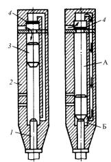 Рис. 177. Принципиальная схема пневматической машины ударного действия: 1 – хвостовик рабочего инструмента; 2 – цилиндр ствола; 3 – поршень-боек; 4 – воздухораспределительное устройство; А – камера прямого хода поршня-бойка; Б – камера обратного хода поршня-бойка