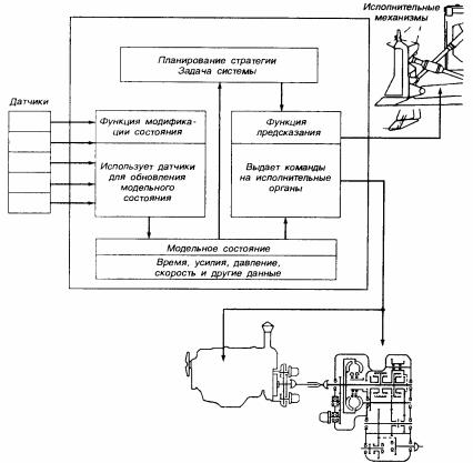 ного состояния к другому на основании сигналов датчиков) и функция предсказания (устанавливающая требуемое модельное состояние и формирующая набор команд наисполнительные органы).