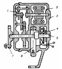 Рис. 181. Двухпозиционный двигатель: 1 – редуктор; 2 – однофазный асинхронный электродвигатель; 3 – корпус; 4 – выключатель; 5 – редуктор; 6 – шток; 7 – муфта
