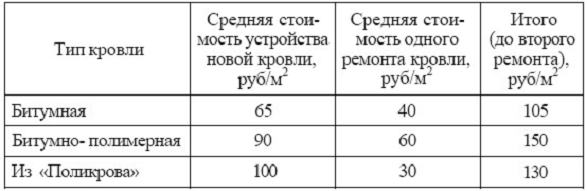 Затраты на устройство и содержание разных видов кровли приводятся в