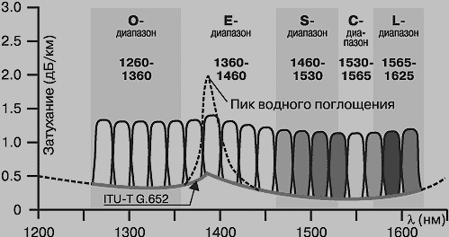Наиболее часто используется волокно ITU G.652, которое имеет так называемый водяной пик, т.е. резкое, скачкообразное увеличение затухания на определённой длине волны.