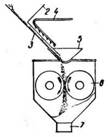 калия с ниппелями для опрыскивания соли; 5 - горловина вальцового станка; 6 -