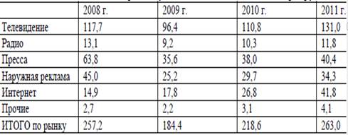 Таблица 1. Расходы на рекламу в России за 2008-2011 г., млрд. руб.