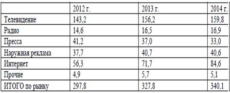 Таблица 2. Расходы на рекламу в России за 2012-2014 г., млрд. руб.