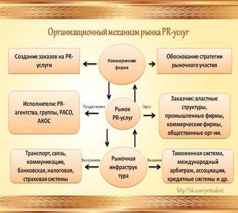 Как сложное образование, которое имеет структуру с множеством принципов, критериев и исходных условий работы рынок услуг в целом является объективной предпосылкой развития системы РR-услуг. Данные связи позволяют совершенствовать и сделать эффективнее составляющие маркетинговых коммуникаций и рыночных механизмов для достижения коммерческого успеха, рыночной стабильности, сформировать положительный имидж тех или иных предприятий.