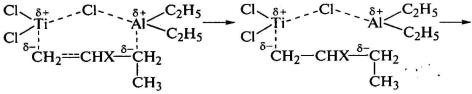 При полимеризации диеновых мономеров образуется π-аллильный комплекс мономера с переходным металлом, который также работает по принципу вытеснения предыдущего мономерного звена последующим. Цепь обрывается путем отщепления растущей макромолекулы от каталитического комплекса и передачи цепи на мономер или при реакции с молекулой триалкилалюминия, не связанного с TiCl3: