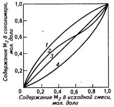 · при r1<1 и r2<1, r1>1 и r2<1, r1<1 и r2>1 происходит статистическая сополимеризация, и составы сополимеров и исходных смесей мономеров различны, кроме одной точки азеотропа при r1<1 и r2<1;