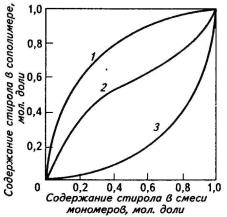 Таким образом, по сравнению со свободнорадикальной сополимеризацией стирол более реакционноспособен в катионной сополимеризации, а метилмет-акрилат - в анионной. В зависимости от механизма сополимеризации из одного и того же состава смеси мономеров можно получить сополимер близкого состава (свободнорадикальный), с более высоким содержанием стирола (катионный) или метилметакрилата (анионный). Влияние констант r1 и r2 на состав сополимеров можно суммировать так: