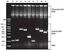 Электронно-микроскопический метод определения молекулярной массы ДНК основан на измерении длины вытянутых молекул ДНК. Известно, что на 0,1 нм протяженности ее молекулы приходится масса, равная 197 Да. Умножая это значение на экспериментально найденную длину, находят значение молекулярной массы. Молекулярная масса эукариотических ДНК выше, чем у ДНК прокариот (например, в одной из хромосом плодовой мушки дрозофилы она достигает 7,9 х 1010). Кроме того, в состав митохондрий и хлоропластов входят кольцевые молекулы ДНК с молекулярной массой 106-107. ДНК этих органелл называют цитоплазматической; она составляет примерно 0,1% всей клеточной ДНК.