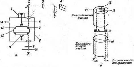 балансировочной ячеек (б). 1 - мотор; 2 - зеркало; 3 - линза; 4 -