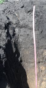 - верхній перехідний, темно-сірий з буруватим відтінком, досить добре гумусований, вологий, грудкуватий, середньосуглинковий, з глибини 57 см бурно скипає від HCl, слабко ущільнений, зустрічаються кротовини заповнені слабкогумусованим матеріалом та червороїни. Поступово за забарвленням переходить у: |
