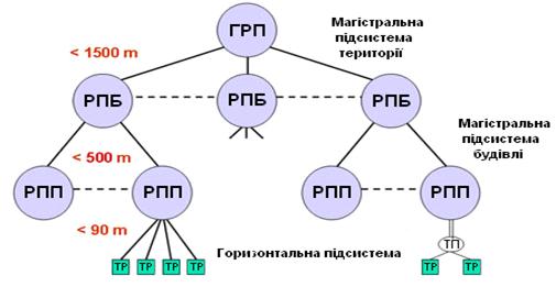 • всі розподільні вузли будівлі з'єднуються кабелями вертикальної підсистеми з головним розподільчим вузлом;