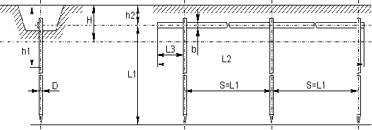 Типовий розрахунок опору розтіканню електричного струму заземляючого пристрою, що складається з вертикальних заземленнь, виконується по приведених нижче формулах: