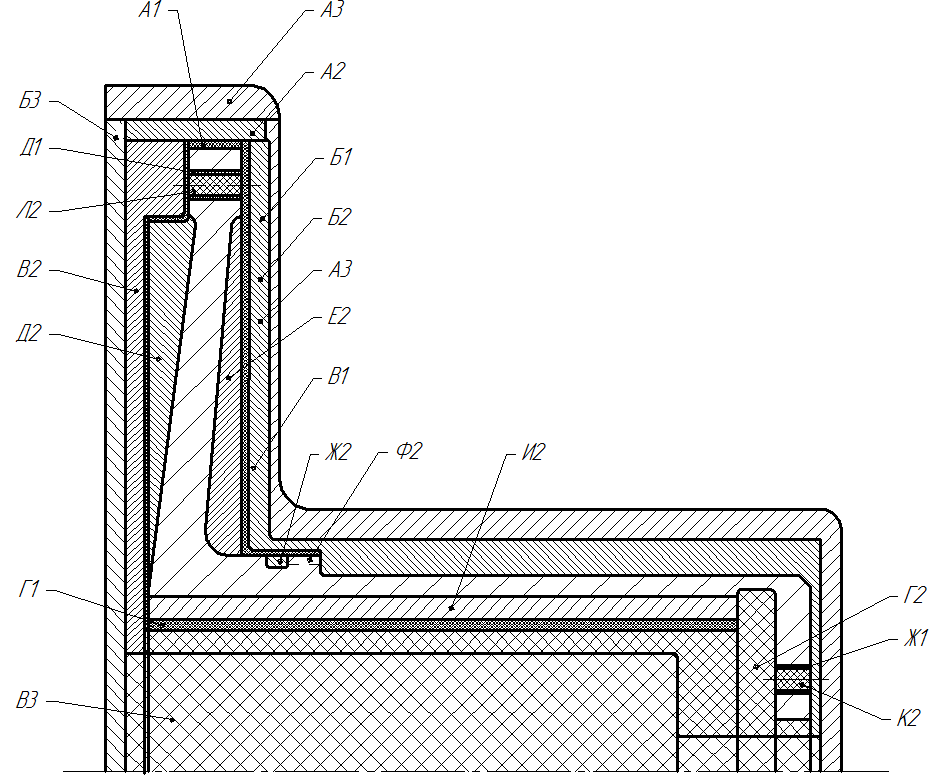 Рисунок 5.1 – Методы обработки детали (Позиции А1, Б1, В1, Г1 – шлифование; Ж1 – нарезка резьбы; А2, Б2, В2, Г2, Д2, Е2, Ж2 – чистовое точение; Ф2 – фрезерование; И2 – долбление; Л2, К2 – сверление; Д3 – развёртывание, А3, Б3, В3 – черновое точение (сверление)).
