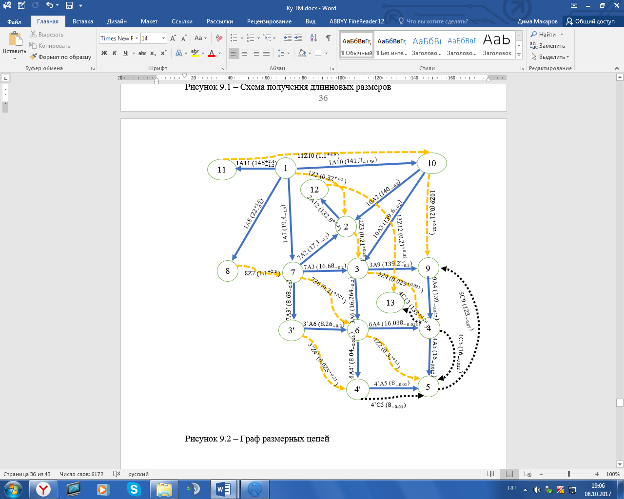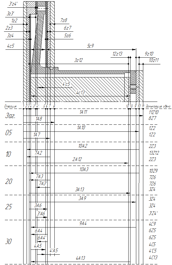 Длинновые операционные размеры рассчитываем, используя метод графов. Для этого строится схема обработки детали и на её основании строится граф размерных цепей. Согласно нему, составляем уравнения размерных цепей и сводим в ведомость расчета (таблица 9.1).