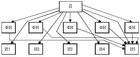 На рис. 1 административные связи функциональных начальников с исполнителями (И1 - И4) такие же, как и для исполнителя И5 (они не показаны в целях обеспечения ясности рисунка).