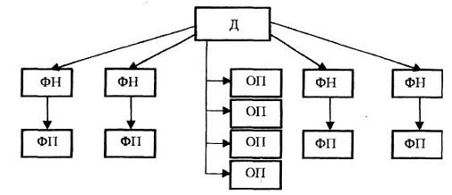 Рис. 2. Линейно-функциональная структура управления. Д - директор; ФН - функциональные начальники; ФП - функциональные подразделения; ОП - подразделения основного производства.