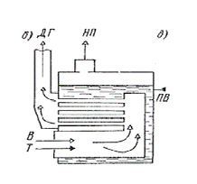 · газотрубные - горячие дымовые газы проходят внутри так называемых дымогарных труб, а вода омывает их снаружи; (Рис.1, б)