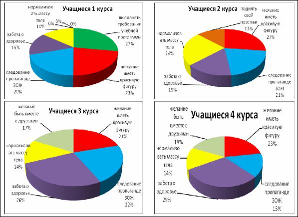 На 4 курсе забота о здоровье занимает 1 место = 8,9 б., на 2 месте желание иметь красивую фигуру = 6,8 б., 3 месте желание быть вместе с друзьями = 5,6 б., на 4 месте следование пропаганде ЗОЖ= 4,5 б., на 5 месте нормализовать массу тела = 4,3 б.
