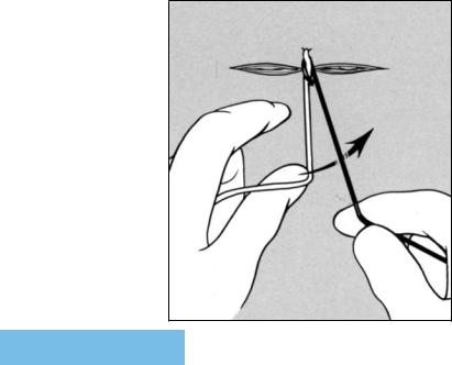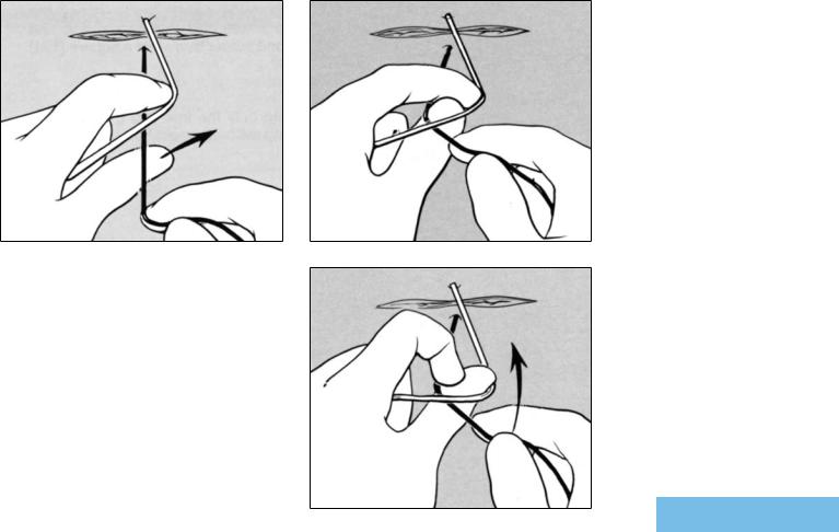 After the tip of the left index finger contacts the tip of the left thumb (tip- to-tip pinch), both are advanced down (arrow) through the suture loop so that only the tip of the left index finger remains in the loop.