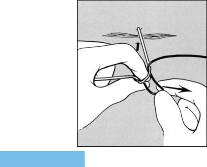 be passed down through the suture loop. The free suture end is regrasped between the tips of the right thumb and index finger to withdraw (arrow) it through the suture loop to form a single-wrap throw.