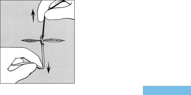 With the suture ends grasped in the palms of the surgeon’s hands, the tips of the index fingers and thumbs position the suture ends in a direction (arrows) perpendicular to that of the wound. The surgeon applies constant tension to the suture ends, which advances the first single-wrap throw of the square knot to the surface of the wound. Advancement of the first throw is complete when the divided skin edges of the mid-portion of the wound are approximated.