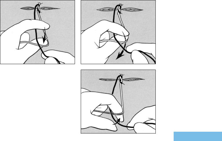 The dorsum of the tip of the left thumb is passed under its suture end in order to direct it beneath (arrow) the other suture end that is held by the right hand. During formation of the second throw, constant tension is applied to the suture ends to maintain wound approximation.