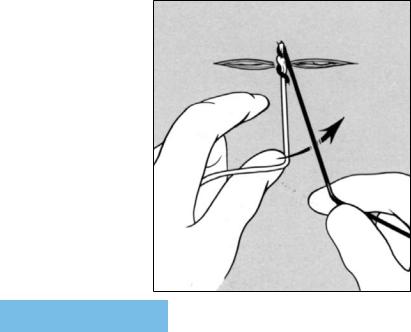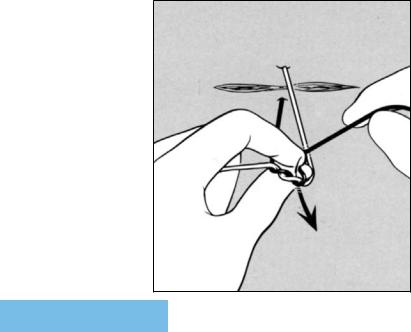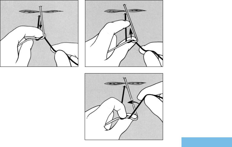 The free suture end grasped between the tips of the left thumb and index finger is passed down (arrow) through the suture loop. The right hand releases its suture end so that it can be withdrawn