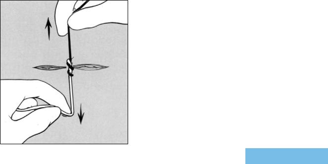 With the suture ends grasped in the palms of the surgeon’s hands, the tips of the index fingers and thumbs position the suture ends in a direction (arrows) perpendicular to that of the wound. The surgeon applies constant tension to the suture ends, which advances the double-wrap, first throw of the surgeon’s knot square to the surface of the wound. Advancement of the first throw is complete when the divided edges of the mid-portion of the wound are approximated.