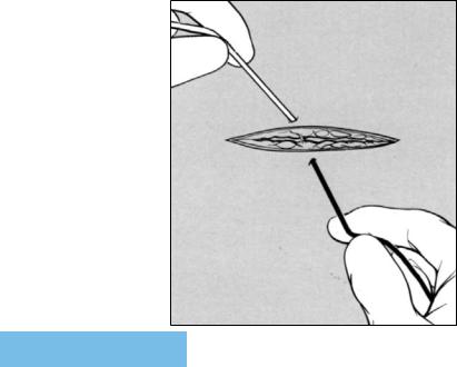 With the suture ends grasped in the palms of the surgeon’s hands, the tips of the thumbs and index fingers position the suture ends in a direction (arrows) perpendicular to that of the wound. The surgeon applies constant tension to the suture ends, which advances the first, single-wrap throw of the square knot to the surface of the wound. Advancement of